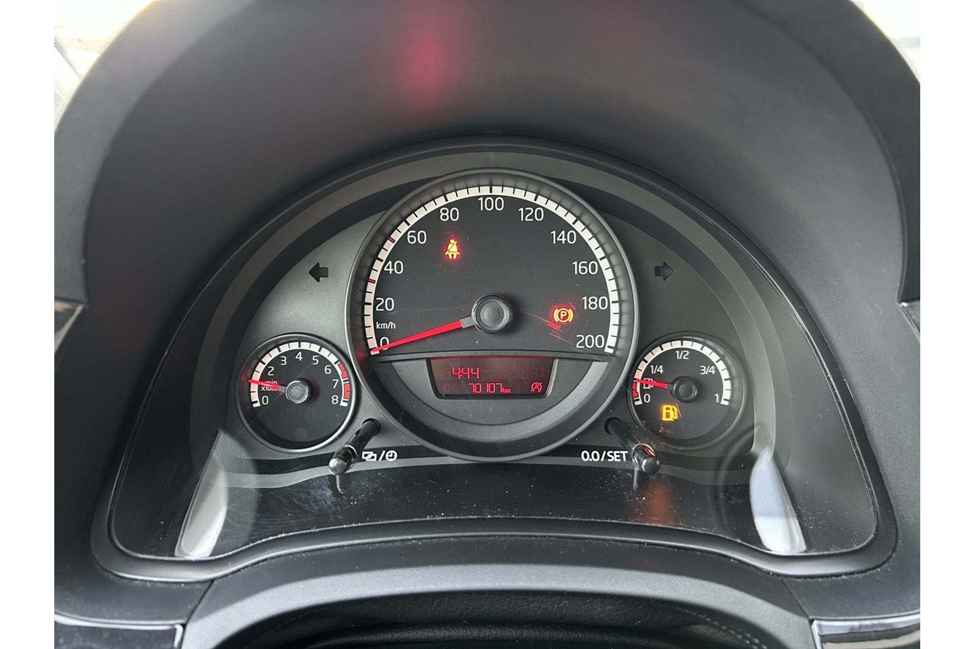 - Instrumentenpaneel bestaande uit snelheidsmeter, kilometerteller, dagteller, toerenteller, klokje en brandstofmeter